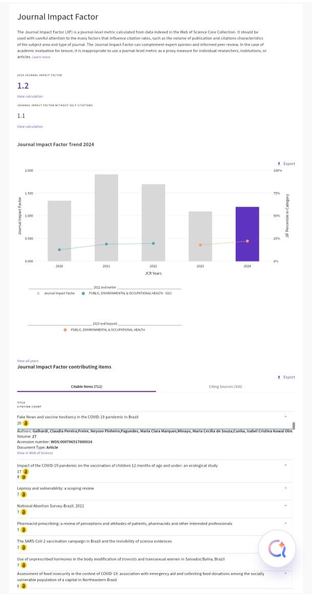 A Revista Ciência & Saúde Coletiva alcançou, em 2024, fator de impacto 1.2 no Journal Citation Reports (JCR), um dos principais indicadores internacionais de relevância científica.O índice é calculado anualmente pela Clarivate Analytics, reconhecendo a qualidade e o impacto global da produção científica publicada.